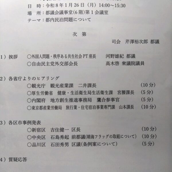 観光庁、厚労省、内閣府、都産労局からヒアリング。そして吉住新宿区長、また港区晴海フラッグの住民の方々、品川区議より事例報告を頂きました。