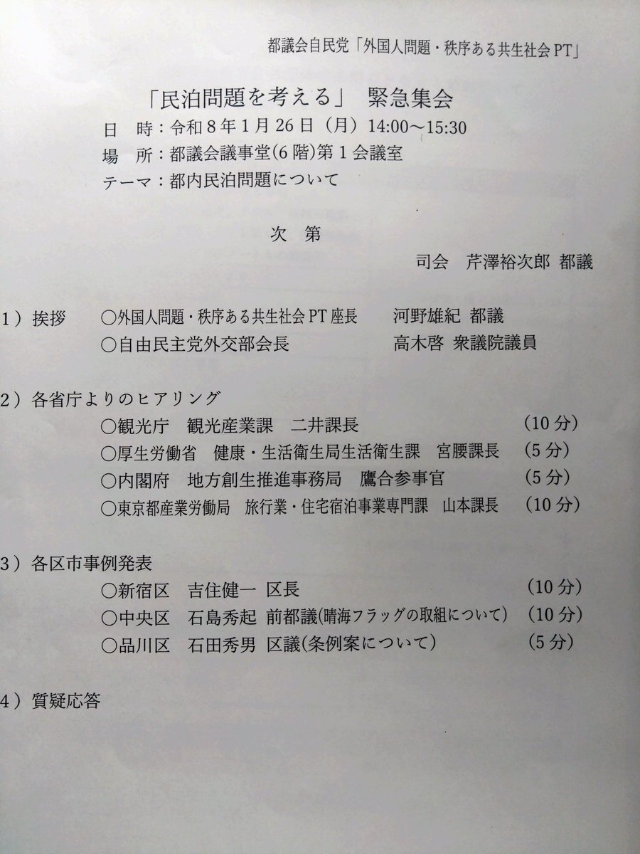 観光庁、厚労省、内閣府、都産労局からヒアリング。そして吉住新宿区長、また港区晴海フラッグの住民の方々、品川区議より事例報告を頂きました。