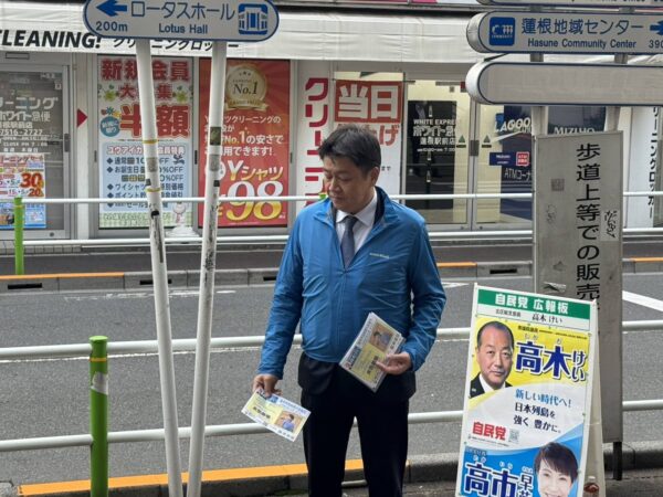 今朝は高木啓代議士の街頭活動を蓮根駅にて、川口区議・近藤区議と一緒に行いました。